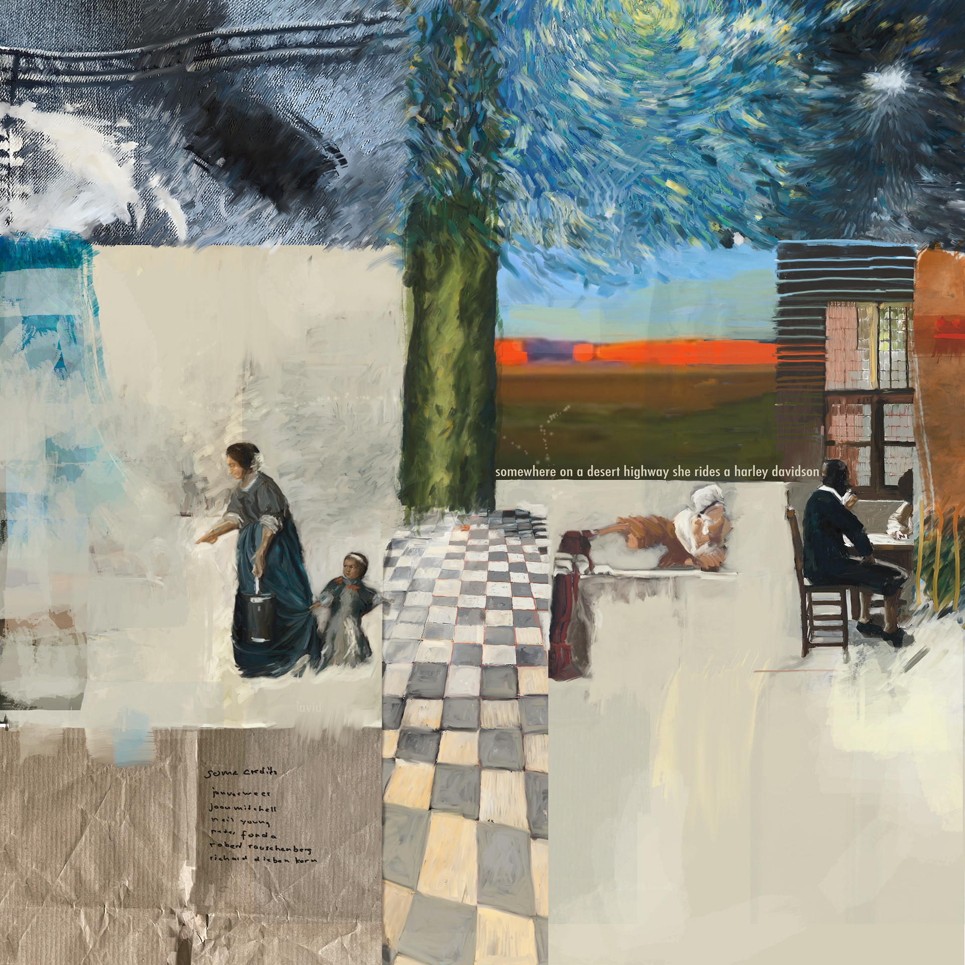 Indeed, before long, selected lyrics began to summon images; these, in turn, set off further associations. A mention of a diner, for instance, conjured the gleam of a checkerboard floor, which soon transformed into the interior of a seventeenth-century Dutch painting. Through its window one could see a Harley—an incongruous detail that seemed to belong to the song’s anonymous heroine, a woman who would gladly trade her dreary present for an imagined freedom: the unknown legend.