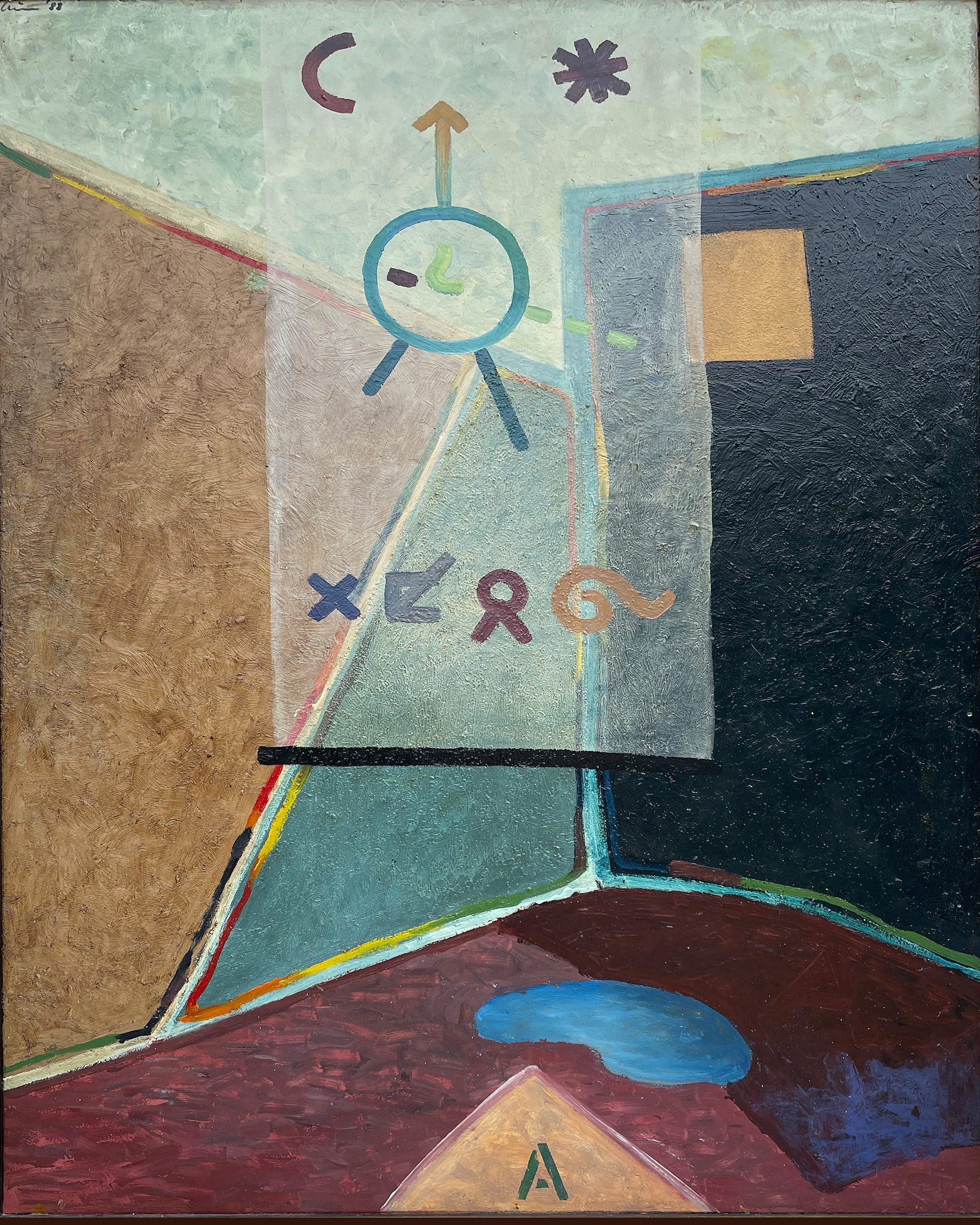 "Das klingt nach einer Beschreibung eines Kunstwerks, wahrscheinlich eines Gemäldes oder einer Collage aus den späten 1980er-Jahren, möglicherweise aus dem Bereich der abstrakten oder informellen Kunst. Die Materialien – Packpapier auf alten Leinenstücken, Lack- und Druckfarbenreste – deuten auf eine experimentelle, vielleicht auch gestisch-expressive Arbeitsweise hin, wie sie z. B. bei Künstlern der Arte Povera, des Neo-Expressionismus oder der informellen Malerei zu finden ist. Die Maße von 180 x 190 cm sprechen für ein großformatiges Werk, das vermutlich eine starke physische Präsenz hat. Die Angabe, dass es sich heute in einer Privatsammlung befindet, deutet darauf hin, dass das Werk einen gewissen Sammlerwert besitzt."